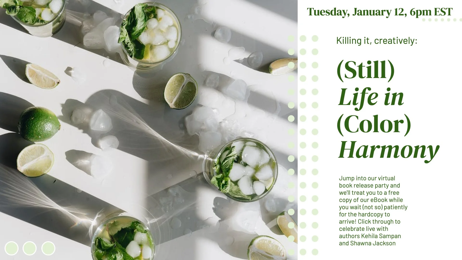 Create a Facebook (bottom right) and Instagram (left) launch party ad and Kindle cover (top) for a book about color harmonies.